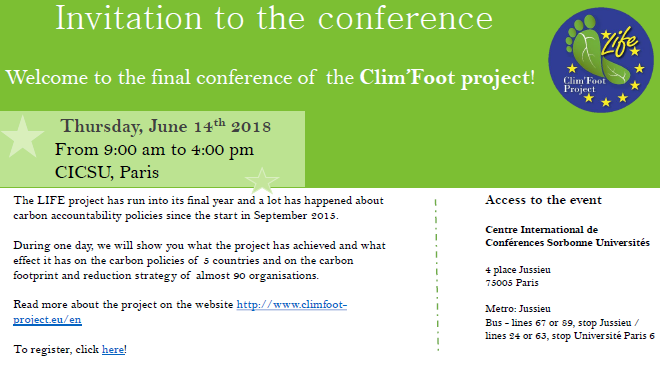 Uz podršku konferencije "Klima 2050: korak prema dekarboniziranom svijetu", ova konferencija će prezentirati europski projekt Clim'Foot i njegove rezultate širokom rasponu dionika (javne i privatne organizacije, donositelji odluka, itd.). Nacrt programa možete preuzeti s desne strane.